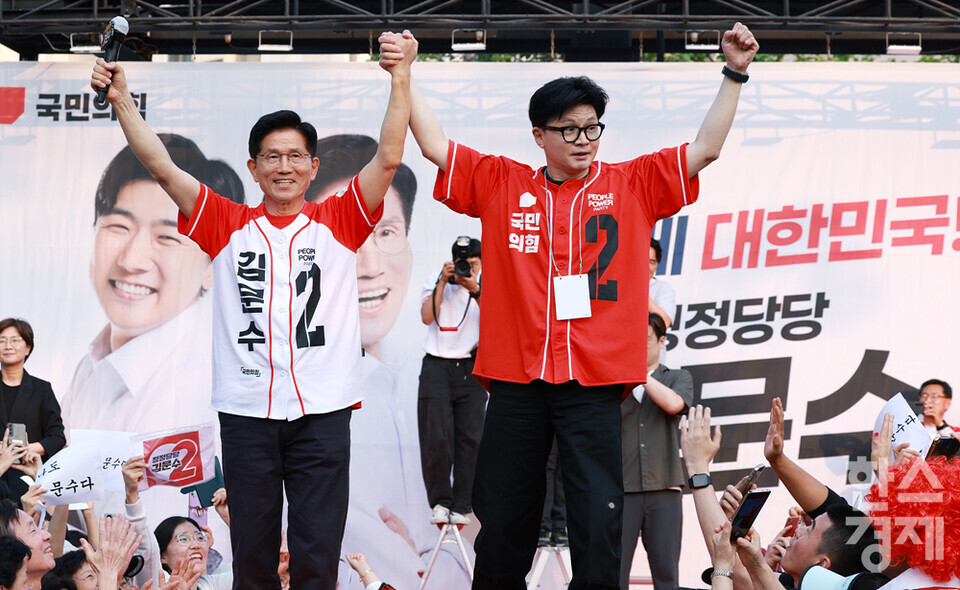 김문수 국민의힘 대선 후보가 26일 서울 도봉구 방학사거리에서 한동훈 전 대표와 집중유세를 하고 있다. /최대성 기자 dpdaesung@sporbiz.co.kr 2025.05.26.