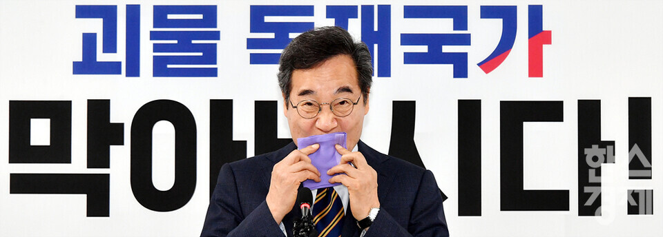 새미래민주당 이낙연 상임고문이 27일 서울 여의도 중앙당사에서 열린 긴급 기자회견에서 입을 닦고 있다. /최대성 기자 dpdaesung@sporbiz.co.kr 2025.05.27.