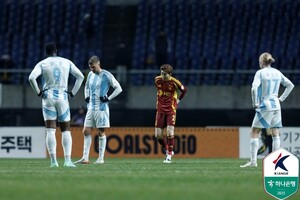 | 한스경제=박종민 기자 | 프로축구 최하위 대구FC가 11위 제주SK FC와 무승부를 올리고 K리그1(1부) 잔류 희망을 이어갔다.대구는 23일 제주월드컵경기장에서 벌어진 제주와 하나은행 K리그1 2025 파이널B 37라운드 원정에서 전반 28분 유리 조나탄에게 선제골을 허용했지만, 후반 23분 지오바니의 동점골로 1-1 무승부를 기록했다.승점 33이 된 대구는 11위(승점 36) 제주와 승점 차를 3으로 유지하며 오는 30일 38라운드 최종전 결과에 따라 2부 강등 여부를 결정하게 됐다. 11위 제주는 9위 울산 HD와 대결하고
