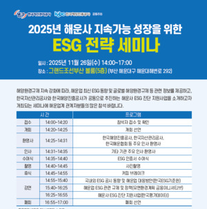 | 한스경제=임준혁 기자 | 한국해양진흥공사는 한국자산관리공사(캠코)와 함께 이달 26일 부산 그랜드조선호텔에서 ‘해운사 지속가능 성장을 위한 ESG 전략 세미나’를 개최한다고 17일 밝혔다.이번 세미나는 해운업계의 ESG 경영 기반을 강화하고 국제 규제 변화에 대응하기 위한 민·관 협력의 일환으로 마련됐다.세미나에는 공동 주최 기관인 해진공, 캠코를 비롯해 한국해운협회, 한국해양수산개발원, 한국해양대학교 등 관계 기관 및 해운기업 대표 100여명이 참석할 예정이다. 지난해에 이어 진행된 제3차 해운사 ESG 진단 사업의 추진 경과