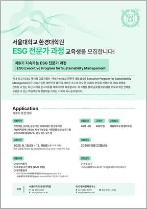 [한스경제=이성철 기자] 서울대학교 환경대학원이 주관하고 ESG행복경제연구소가 홍보·협력기관으로 참여하는 ‘제6기 지속가능 ESG 전문가 과정(ESG Executive Program for Sustainability Management)'이 오는 9월12일 개강한다. 이번 과정은 코로나19 상황 속에서도 높은 관심과 학구열로 성황리에 운영된 제1·2기, 그리고 지난해 성공적으로 마무리된 제3·4기, 올해 상반기에 성료한 제5기에 이어 진행되는 여섯번째 과정이다.기후변화 위기와 이해관계자 자본주의의 부각으로 ESG가 글로벌 메가트렌드