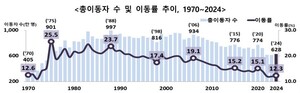 [한스경제=박종훈 기자] 지난해 우리나라 이동인구는 628만3000명으로 전년에 비해 15만5000명 증가한 것으로 나타났다.통계청 2024년 국내인구이동통계에 따르면 인구 백 명당 이동자 수인 인구이동률은 12.3%로 전년에 비해 0.3%p 증가한 것으로 나타났다.과거부터 우리나라 인구이동 추이를 살펴보면, 인구이동률의 정점을 찍었던 것은 1975년으로 25.5%에 달한다. 총 이동자 수의 정점은 1988년 997만명이다. 이보다 더 이전인 1970년만 하더라도 이동자 수 405만명에 이동률 12.6% 수준이었던 것과 비교하면,