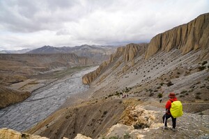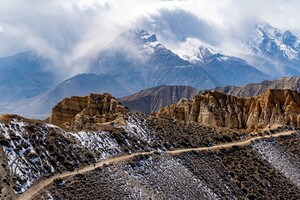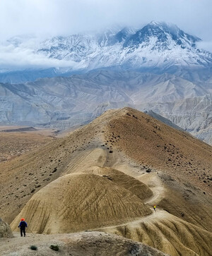 [한스경제] 죽을 둥 살 둥 가파른 고갯마루를 올라서자 야트막한 구릉들이 어울렁 더울렁 춤을 춘다. 수많은 구릉의 곡선들이 파도치듯 흐르며 거친 대지를 순화시킨다. 그 너머로는 은백색의 안나푸르나 연봉이 희미하게 스카이라인을 그리고 있다. 무스탕의 지형은 봉우리, 절벽, 계곡 등의 산세나 높낮이, 색감 등이 워낙 다양해 팔색조 같다. 시시각각 바뀌는 풍광은 보는 각도나 빛의 방향 등에 따라 카멜레온처럼 변한다. 바람이 대지를 쓰다듬듯 훑고 지나가면서 뿌연 흙먼지의 회오리가 하늘로 치솟는다. 용이 용트림 치며 온 천지를 뒤흔드는 것