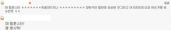 한 누리꾼은 ‘YG엔터테인먼트 양현석 대표가 그룹 빅뱅 멤버 탑에게 최승현이라고 하지 않고 ‘티티티오피’라고 하는 것과 비슷한 느낌’이라는 댓글을 남겨 웃음을 자아냈다.