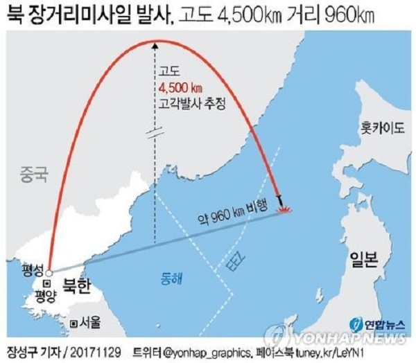 합동참모본부는 "오늘 오전 3시 17분경 북한이 평안남도 평성 일대에서 동해상으로 발사한 장거리 탄도미사일은 고도 약 4천500km, 예상 비행거리는 약 960km"라고 밝혔다.