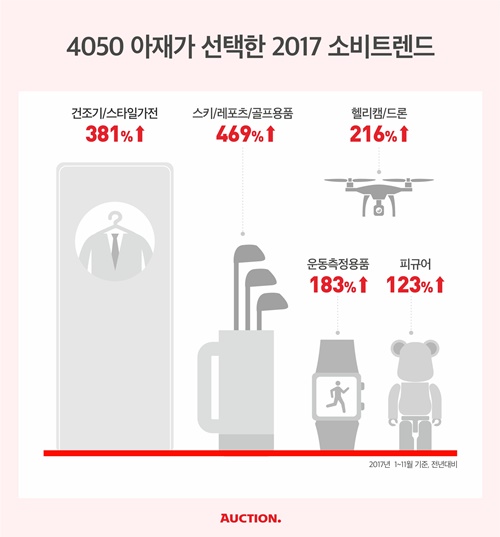 의류 관리기인 건조기와 스타일가전에 대한 4050세대 남성들의 구매율은 무려 5배(381%) 가까이 늘어나며 새로운 ‘잇(IT) 아이템’으로 등극하기도 했다. 제모용품(73%)과 데오드란트(71%)가 각각 오름세를 보였고, 피부관리기기(57%)와 고데기/매직기(22%)도 중년 남성들로부터 적극적인 지지를 얻었다.