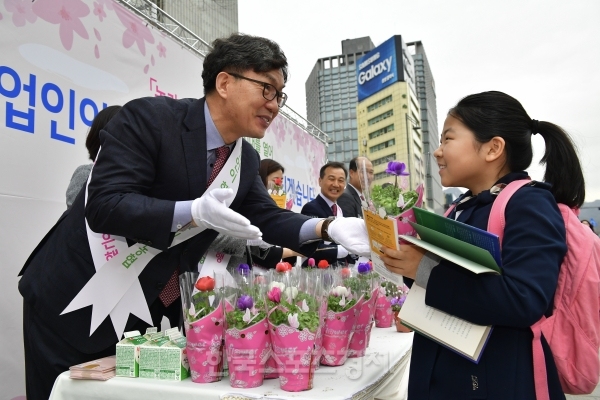 이 행장을 비롯한 농협은행 임직원들은 출근하는 시민들에게 꽃씨·미니화분·홍삼캔디·우유 등을 나눠주며 우리 농산물을 적극 홍보했다.