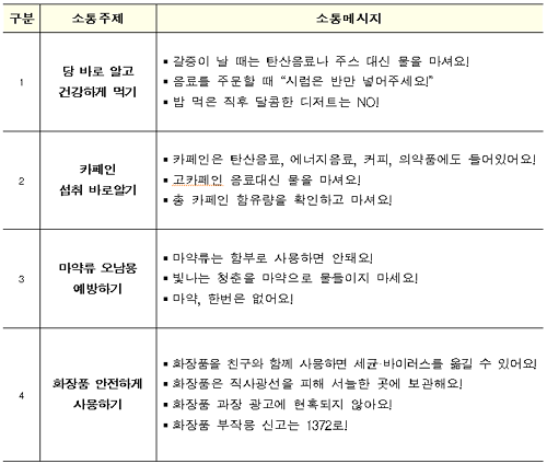 이번 ‘식의약 영리더’ 참가 주제는 ‘당 바로 알고 건강하게 먹기’, ‘화장품 안전하게 사용하기’ 등 4개이며, 이 중 1개 주제를 자유롭게 선택해 활동할 수 있다.