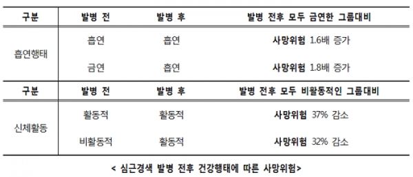 이후 약 4년간 사망한 환자 비율을 분석한 결과, 발병 전후 모두 금연한 그룹과 비교해 전후로 계속해서 흡연한 그룹은 사망위험이 약 1.6배, 발병 후 흡연을 시작한 그룹에서는 사망위험이 약 1.8배 증가한 것으로 관찰됐다.