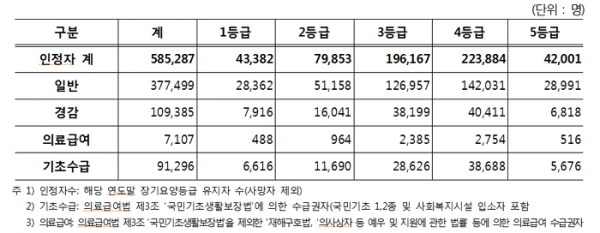 23일 국민건강보험공단(이사장 김용익, 이하 건보공단)이 펴낸 ‘2017 노인장기요양보험통계연보’에 따르면 작년 12월 말 기준 노인장기요양보험 인정자는 58만5287명으로 각 인정등급별 인원구성은 1등급 4만3382명, 2등급 7만9853명, 3등급 19만6167명, 4등급 22만3884명, 5등급 4만2001명이었다. 4등급 인정자가 전체의 38.3%로 가장 많고 3등급, 2등급, 1등급, 5등급 순으로 나타났다.