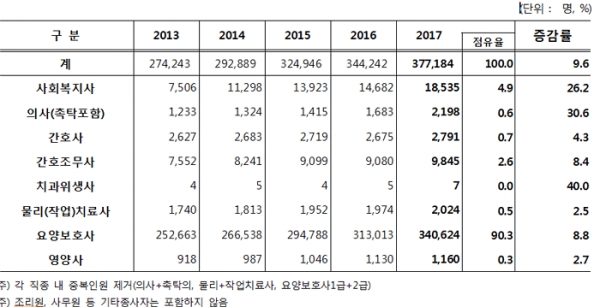 ◇ 장기요양기관 인력 = 작년 말 기준 장기요양기관 인력은 약 9.6% 증가했다. 근무하는 요양보호사는 34만624명으로 전년대비 8.8% 늘었다. 의사는 30.6%, 사회복지사 26.2%, 간호사 4.3%, 간호조무사는 8.4% 각각 증가했다.