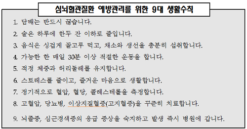 정은경 질병관리본부장은 “심뇌혈관질환의 예방과 관리를 위해서는 자신의 혈압, 혈당, 콜레스테롤 수치를 정기적으로 확인하고 올바른 생활수칙 실천이 중요하다”고 강조했다.
