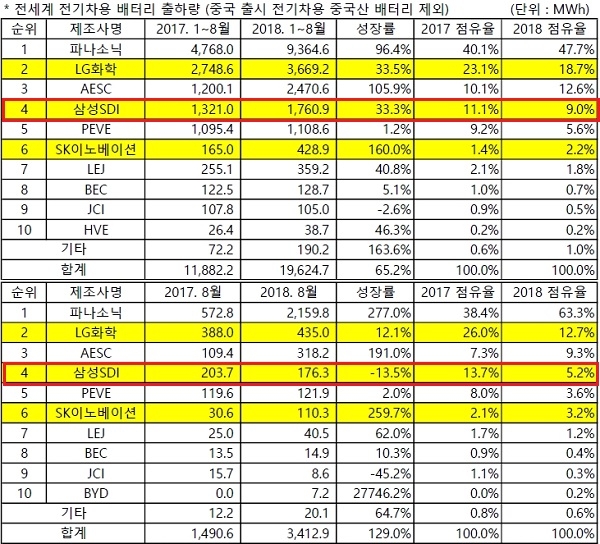 10일 배터리 시장조사기관 SNE리서치가 발표한 '2018년 8월 전세계 전기차에 출하된 비중국산 배터리 출하량 순위'에 따르면 삼성SDI는 176.3MWh로 4위를 기록했지만, 성장률은 전년 동기 대비(203.7MWh) 13.5% 하락했다.