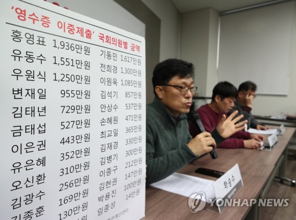 시민단체인 세금도둑잡아라와 좋은예산센터, 투명사회를 위한 정보공개센터, 탐사보도 전문매체 뉴스타파는 4일 오전 서울 중구 성공회빌딩에서 기자회견을 열고 영수증 이중제출로 국민 세금을 빼 쓴 국회의원 26명의 명단을 공개했다.