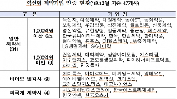 한편 혁신형 제약기업은 2012년 첫 인증을 시작한 이래 올해 네 번째 신규 인증 절차를 진행했다. 2018년까지 혁신형 제약기업으로 인증된 회사는 총 47개 기업이다.