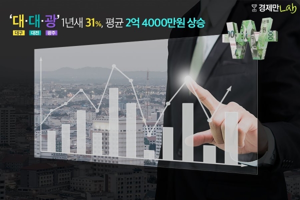 지방 아파트 가격이 하락세를 그리는 것과 달리 ‘대·대·광’ 일대 아파트 가격은 크게 뛰어 오르고 있는 모양새다. 경제만랩이 KB부동산의 주택가격현황을 살펴본 결과, 지난해 1월부터 올해 1월까지 1년간 대구·대전·광주 3곳의 아파트 평균 가격 상승률은 7.28%로 나타났다. 같은 기간 경기도 집값 상승률은 6.26%다.