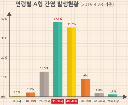 질병관리본부에 따르면 지난 4월 기준으로 국내 A형 간염 환자의 86%는 20~40대 환자이다. 이중 30대가 37.4%로 가장 많고 40대도 35.2%(20대 13.5%)로 높다. 이들은 어린 시절 위생적 환경에서 자랐기 때문에 A형 간염에 감염된 적이 없어 자연 항체가 없는 경우다.