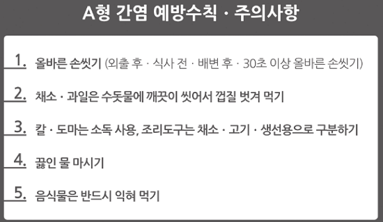 A형 간염은 무엇보다 예방이 중요하다. 감염 경로는 경구감염으로 환자의 분변에 오염된 손을 통해 타인에게 접촉하여 전파되거나 바이러스에 오염된 음식과 물을 섭취해 감염될 수 있다. 또한 감염환자의 혈액을 수혈 받는 등 혈액을 매개한 감염도 가능하다. 따라서 외출 전후, 화장실 사용 후, 음식 조리 전에는 흐르는 물에 30초 이상 손 씻기로 청결을 유지해야 하며 끊인 물 마시기, 음식물 익혀먹기 등으로 철저한 개인위생을 실천하는 것이 중요하다.