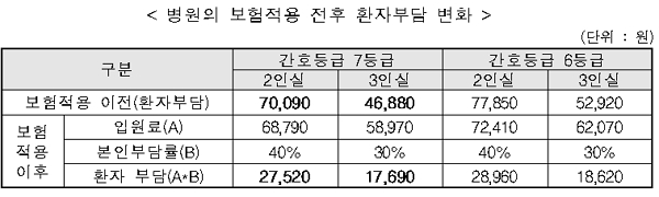 병원·한방병원 2·3인실에 건강보험이 적용되면, 환자 부담이 2인실의 경우 7만 원에서 2만8000원으로, 3인실의 경우 4만7000원에서 1만8000원으로 3분의 1 수준으로 줄어든다(간호 7등급 기준). 연간 약 38만 명의 환자들이 입원료 부담 완화 혜택을 볼 것으로 예상된다.