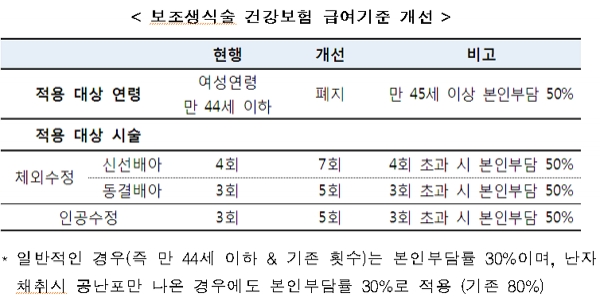 이번 개선방안을 통해 연령 제한은 폐지하고, 체외수정시술 신선배아 7회, 동결배아 5회, 인공수정시술 5회로 확대하되, 이번에 추가된 부분은 본인부담률을 50%로 적용하기로 한 바 있다.