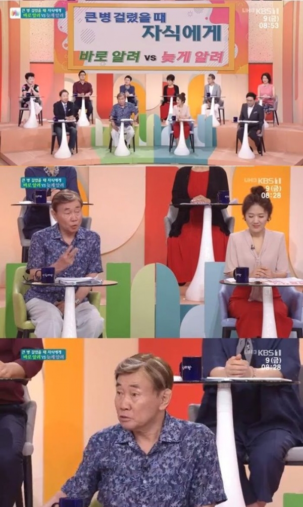 이날 출연진은 '큰 병 걸렸을 때 자식에게 바로 알려 vs 늦게 알려'라는 주제로 대화를 나눴다.