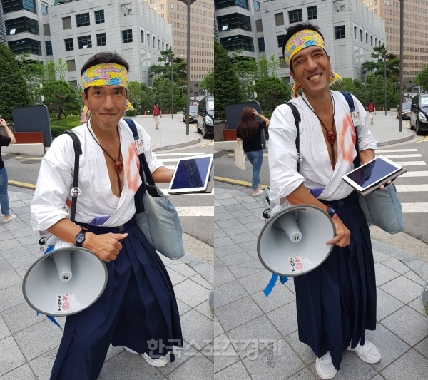 그의 옆에는 '평화의 소녀상'과 일본에 항의하는 시위자들의 텐트까지 있어 모습만 봤을 때는 영락없는 일본을 옹호하는 시위자로 보였다. 그의 이름은 다카시 미기타(右田隆). 그는 자신을 "이름에는 '오른쪽 우'가 있지만 성향은 '왼쪽'인 일본 배우"라고 기자에게 힘줘 소개했다.