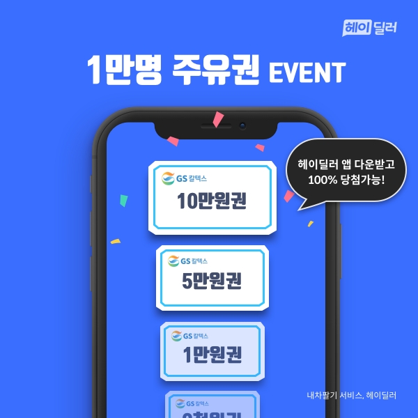 [한스경제=이정민 기자] 온라인 내차팔기 서비스 헤이딜러는 25일 오전 10시부터 선착순 1만명에게 최대 10만원 GS칼텍스 주유권을 증정하는 이벤트를 진행한다고 24일 밝혔다.
