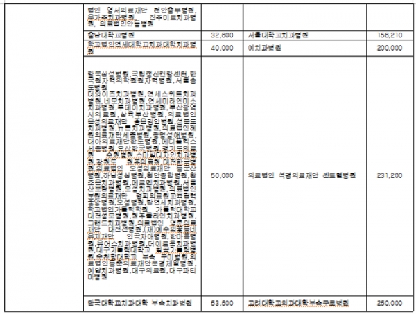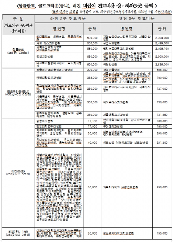 구체적으로 살펴보면 임플란트의 경우, 병원급 이상 452곳의 평균 치료비용은 132만원이었다. 가장 낮은 곳은 50만원(메디플렉스 세종병원, 국군양주병원)이었고, 가장 높은 곳은 283만원(국립암센터)으로 5.6배의 가격 차이가 발생하는 것으로 나타났다.