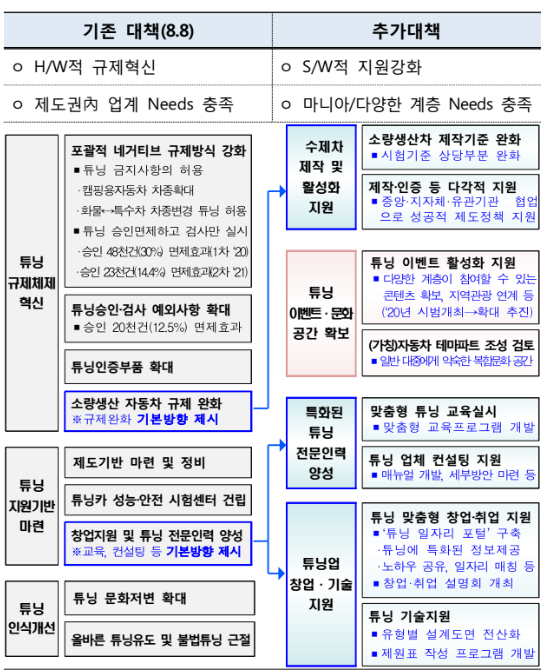또 튜닝을 쉽게 접하고 즐길 수 있도록 튜닝 이벤트를 활성화하는 등 자동차 문화공간을 확보할 수 있는 방안도 추진한다. 내년 중에 국토부(한국교통안전공단)에서 총괄·후원하고 한국자동차튜너협회(국토교통부 산하), 지자체 등 유관기관 협업으로 시범행사를 개최하고, 향후 미비점을 보완하여 행사를 확대·시행한다. ▲모터스포츠 ▲전시회 ▲중소업체 홍보 ▲일반인 체험 ▲캠핑카 공간확보 등 다양한 이벤트를 마련하고, 지역 관광 및 축제와 연계하여 시너지 효과를 극대화한다는 방침이다.
