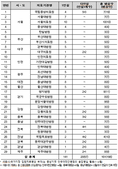 한편 올해 1월 기준 전국 16개 시·도 29개 병원에 국가지정 입원치료병상 음압병실이 있다. 1인실 141개, 다인실 20개, 총 161병실, 198개 병상이 있다. 병상수를 기준으로 서울 43개, 부산 10개, 대구 10개, 인천 16개, 광주 12개, 대전 8개, 울산 5개, 경기 28개, 강원 8개, 충북 9개, 충남 7개, 전북 11개, 전남 10개, 경북 5개, 경남 7개, 제주 9개 등이다. 세종시는 4월까지 충남지역 단국대천안병원 음압병실을 활용한다.
