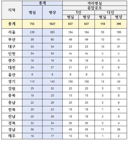 이와 별도로 전국에는 총 755병실 1027병상의 음압 병상이 있다(지난해 12월 기준). 1인실은 637병실 637병상이다.