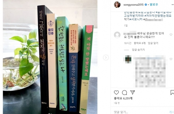 26일 송윤아 인스타그램의 한 게시물에는 불륜 의혹을 제기하는 한 누리꾼의 댓글이 달렸다. 이 누리꾼은 “배우님 궁금한 게 있어요. 진짜 불륜 아니에요?”라며 글을 남겼다.
