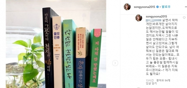 이에 송윤아는 직접 댓글을 달며 “살면서 착하게만, 바르게만 살아지지는 않겠지만 도덕적으로 해서는 안 될 일들이 있을 것”이라며 “저 역시 그런 나쁜 일은 안 해왔다고 자부하면서 살고 있고 그렇게 살아서도 안 된다”고 썼다.