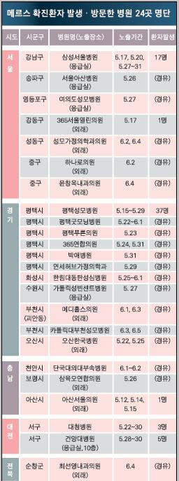 정부는 초동 대처부터 오락가락했다. 후속조치는 더 엉망이었다. 대량 감염자가 발생한 평택성모병원에 대한 조사는 첫 환자 발생 후 16일이 지난 5일에야 이뤄졌다. 조사에서 병원 화장실, 에어컨, 문고리 등 병원 시설물 곳곳에서 바이러스가 검출 됐다. 이 상태라면 환자와 직접밀착접촉 없이도 병원 방문자들은 감염될 수 있다. 감염자와 ‘1시간 이상’ 접촉해야 감염된다는 정부의 초기 발표는 뒤집혔다. 뒤늦게 메르스의 전파 범위와 강도가 예상보다 넓고 강력한 것으로 밝혀지자 확진 환자 및 환자 방문 병원 명단을 서둘러 발표했다.