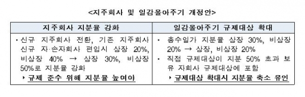 이들은 “지주회사에 대해 자회사, 손자회사에 대한 의무지분율을 높인 것은 과도한 규제”라면서 “일반 기업집단이 지주회사 체제로 전환할 때 지분매입 비용 증가하기 때문에 신규 투자와 일자리 창출 여력이 감소할 수밖에 없다”라고 강조했다. 이는 특히 그간 정부의 지주회사 전환 유도 정책과도 배치돼 정부 정책의 신뢰성이 떨어질 우려가 있다는 내용이다.