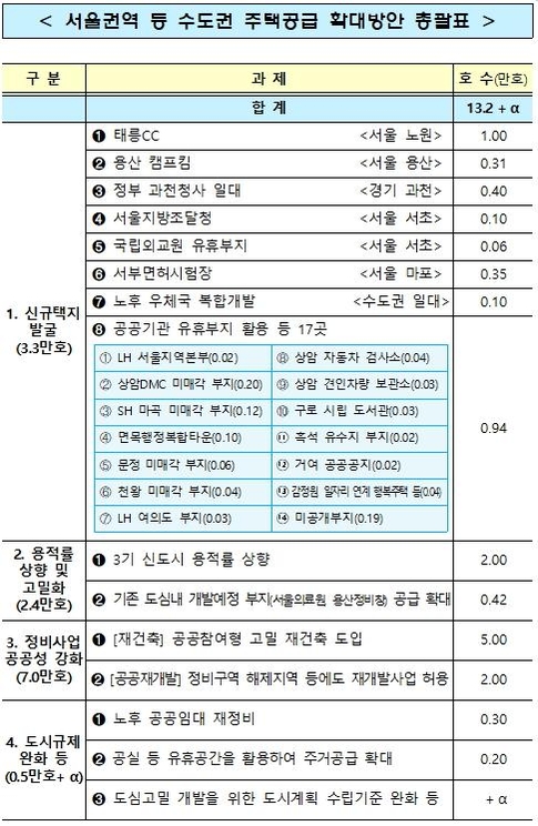 [한스경제=황보준엽 기자] 정부가 수도권 내 13만2000호를 추가공급 하기로 했다. 이를 위해 군부지, 이전기관 부지 등 신규 택지 발굴과 노후단지를 재건축하는 방식을 활용한다. 지난 5?6대책 때 발표된 공급 방안까지 포함하면 서울권역을 중심으로 총 26만2000가구가 공급될 예정이다.