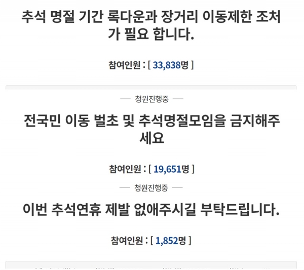 한 청원인은 ‘추석 명절 기간 록다운과 장거리 이동제한 조처가 필요하다’고 글을 올렸다. 청원인은 “추석 기간 중 자발적 혹은 비자발적 친지 간의 방문 등 전국적으로 광범위하게 가정에서 일어난다”며 “2차 대유행을 하는 시점에서 각 가정에서 지역감염으로 걷잡을 수 없이 확산할 우려가 높다”고 말했다. 이어 “추성 명절 기간 동안 정부에서 확실한 지침을 내려야 하며, 공익의 차원에서 결단이 필요한 시점이다. 가족, 친지 회합 자제, 제사 연기, 장거리 이동 자제의 강력한 권고를 내려 달라”고 강조했다.