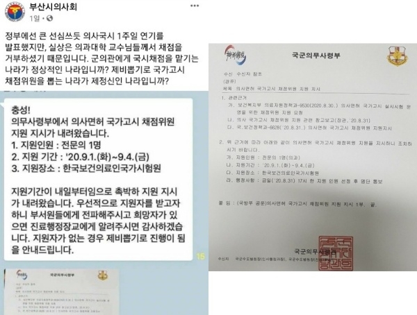 부산시의사회는 사령부의 '의사국시 채점위원 지원 공문'과 이를 전달하는 관계자의 '카카오톡 내용'을 지난 1일 공식 페이스북에 게재했다.