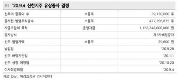 한편 증권사들은 신한금융이 유상증자로 확충한 자본을 수익성 제고에 적절한 M&A 및 디지털투자, 배당정책 등에 사용할 경우 주주가치 제고가 가능하다고 덧붙였다. 또 자본 적정성이 개선되고 자산 건전성 불확실성을 해소하게 될 것이라고 기대했다.
