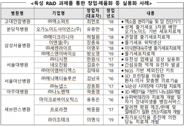 최근에는 연구중심병원이 육성한 연구개발 과제에서 창출된 성과물이 창업으로 이어지고 있다. 올해에는 10개 병원에서 추진 중인 17개 연구개발 과제를 지원하기 위해 정부 예산 372억 원이 투입됐다.