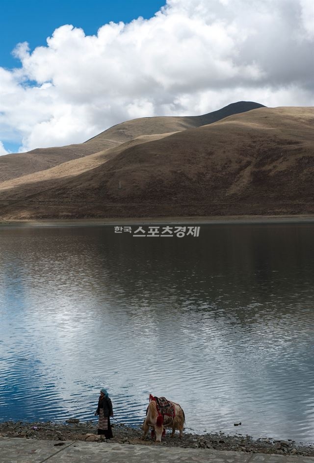 암드록쵸는 ‘산 위의 목초지’란 의미로 해발 4,441m의 고지에 있는 티베트에서 세 번째로 큰 염호(鹽湖)다. 바다가 융기해 생긴 짠물의 호수로, 조개, 암모나이트 등의 화석이 발견된다. 길이 130km, 너비 70km, 면적 638만㎢에 총둘레 250km의 거대한 호수다. 호수는 9개의 섬을 품고 있다. 마나사로바, 남쵸, 라모라쵸와 함께 티베트의 4대 성호(聖湖)로 꼽힌다. 바람이 잦아 그런지 호수 면은 잔물결 하나 없는 유리알이다.