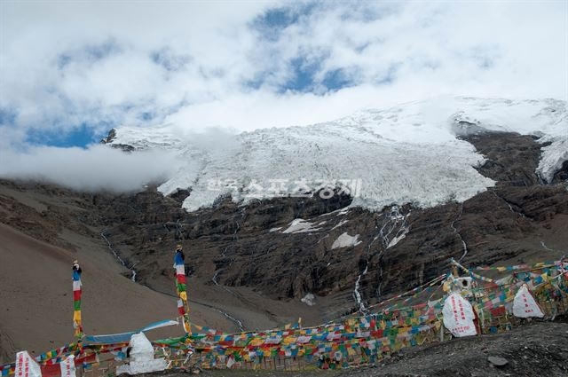 해발 4,000~5,000m의 ‘하늘길’, 신장공로는 전인미답의 험로다. 계곡과 산 능선을 따라 용의 꼬리처럼 구불구불 멋진 곡선을 그리며 아슬아슬하게 나있는 도로를 힘겹게 오른다. 해발 4,990m의 캄발라 고개 정상에 오르니 타루쵸(오방색 깃발)와 룽다(불경을 적은 깃발)가 반갑게 맞는다. 나부끼는 타루쵸 깃발 사이로 전갈모양으로 길게 누워 있는 옥빛의 암드록쵸 호수가 그림처럼 내려다보인다. 자줏빛 산과 짙푸른 하늘, 흰 뭉게구름, 옥색 물빛이 어우러져 환상의 조화를 이룬다. 전망대와 연결된 호수 오른쪽의 완만한 민둥산은 정상을 뒤덮은 타루쵸로 마치 하늘 위 꽃밭 같다.