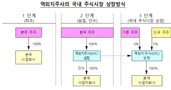 외국기업의 국내 주식시장 상장 방식은 크게 두 가지다. 역외지주사 주식 상장과 고유사업 영위 회사 주식·예탁증서 상장이 있다.