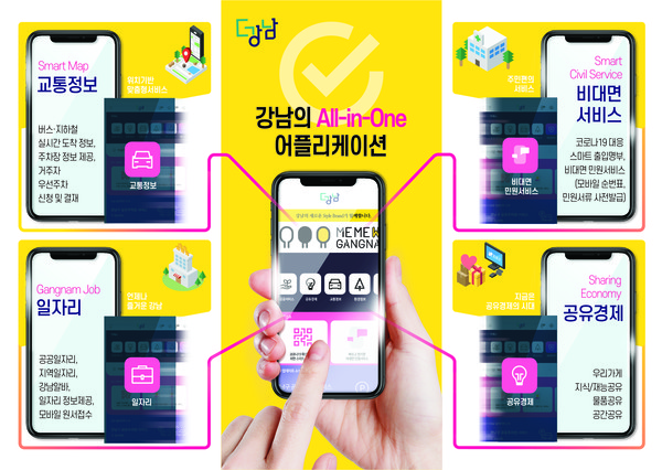 비대면 민원서비스(순번표 사전발급, 민원서류 사전 신청)를 통해 민원 대기시간을 최소화하고 스마트 출입명부(QR코드)를 통한 출입자 관리, 저소득층을 위한 복지급여 간편신청, 취약계층 푸드마켓 온라인 배송 등 코로나 시대를 맞아 적극적인 서비스를 구축·운영중이다. 또 일자리 정보(공공, 민영일자리, 강남알바)도 구직자들에게 제공하고 일자리 신청도 모바일로 할 수 있도록 했다.