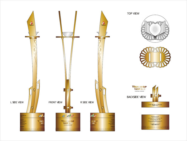 이순신컵의 우승 트로피의 높이는 무려 197.2cm다. 이순신 장군의 장검과 길이가 같다. 이어 좌대의 지름은 40cm며 도배는 은으로 제작됐다. 오륜색 요트는 은판에 다섯 가지 보석의 원석을 상감기법으로 새겨 넣었으며 컵의 프레임은 청동주물로 제작했다.