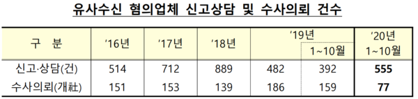 금융감독원이 23일 공개한 자료에 따르면, 올해 1~10월 중 불법사금융신고센터에 접수된 유사수신 행위 신고·상담건은 555건으로 392건을 기록한 지난해 동기 대비 163건(41.6%) 증가했다. 금감원은 이중 구체적인 혐의가 드러난 77개사에 대해 수사당국에 수사를 의뢰했다.