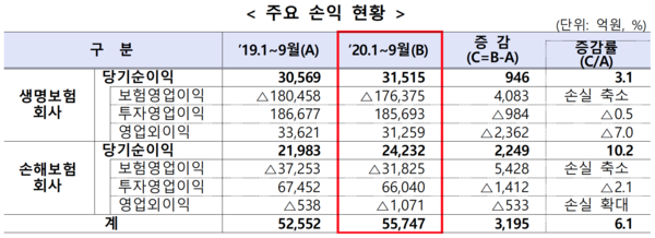 금융감독원이 24일 발표한 '보험회사 경영실적(잠정치)'에 따르면 올해 1∼9월 생명·손해보험업계의 당기순이익은 5조5747억원으로 5조2552억원을 기록한 지난해 동기 대비 3195억원(6.1%) 늘었다.