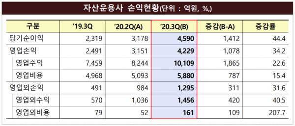 금융감독원이 2일 발표한 '3분기 자산운용사 영업실적'(잠정) 자료에 따르면, 3분기 중 자산운용사의 당기순이익은 4590억원으로 3178억원을 기록한 2분기 대비 1412억원(44.4%) 증가했다. 이는 2319억원 기록한 지난해 3분기와 비교했을 땐 2271억(97.9%) 증가한 수치다.