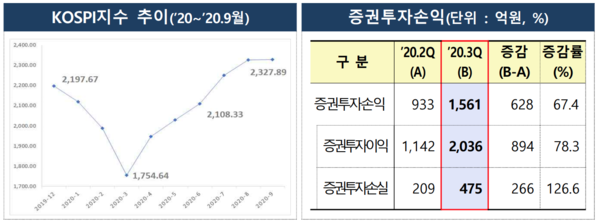3분기 파생상품 손익을 포함한 ▲증권투자손익은 1561억원으로 933억원을 기록한 2분기 대비 628억원(67.4%) 증가했다. 코스피지수는 ▲지난해 12월말 2197.67 ▲올해 3월말 1754.64로 하락했다. 이후 ▲6월말 2108.33으로 반등해 ▲9월말 2327.89를 기록했다.