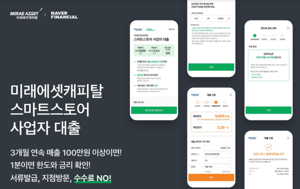 네이버파이낸셜은 1일부터 미래에셋캐피탈과 함께 네이버 스마트스토어 사업자를 위한 신용대출 상품 ‘미래에셋캐피탈 스마트스토어 사업자 대출’을 시작했다.